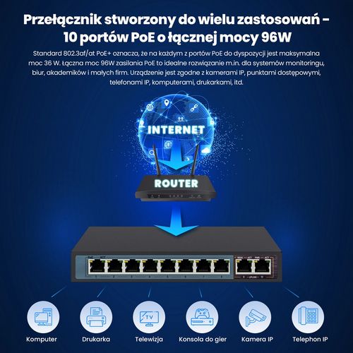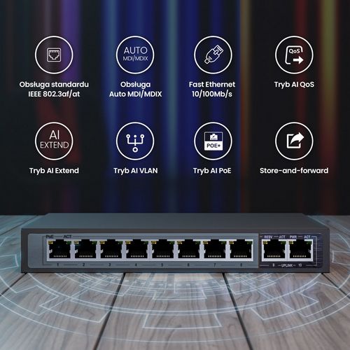 Extralink PoE Switch CERES 8x 100Mb/s PoE/PoE+, 2x RJ45 Uplink 100Mb/s, 96W