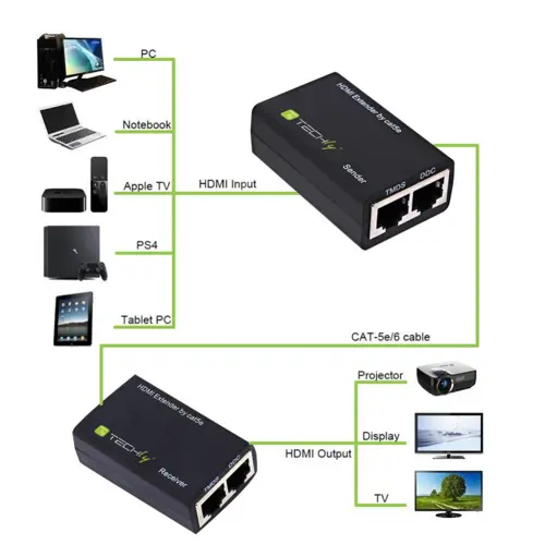 HDMI Ekstender preko UTP Cat5e/6 RJ45 uvijenog parnog kabela do 30m, TECHLY, 8057685301153 (preko UTP Cat5e/6, RJ45, doseg do 30m)