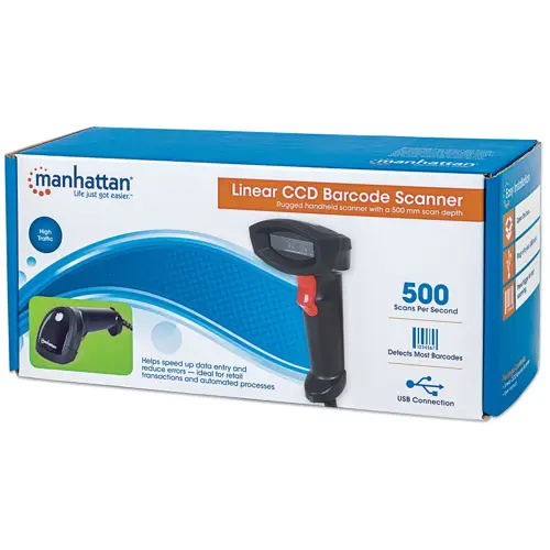 Manhattan Linear CCD Handheld Barcode Scanner, USB, 500mm Scan Depth, IP54 rating, Cable length 1.5m, Max Ambient Light 100,000 lux (sunlight), Black, Three Year Warranty