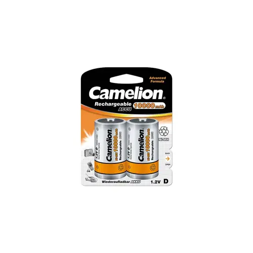 Ni-MH punjiva baterija, dva komadakapacitet 10 Ahtehnički podaci:-Camelion NH-D10000BP2. Tehnologija baterije: Nikal kadmij hidrid, Trajanje baterije: 10000 mAh, Napon baterije: 1.2 V. Težina: 180 g, Visina: 61 mm, Promjer: 32.5 mm. Boja uređaja: Sr