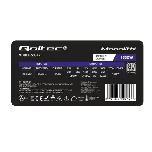 Qoltec Powerful ATX 1650W Power Supply | 80 Plus Platinum