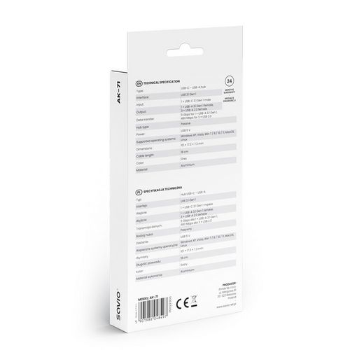 USB Hub SAVIO AK-70 (4 u 1, 3 × USB-A 2.0, 1 × USB-A 3.1 GEN 1, 5 Gbps)